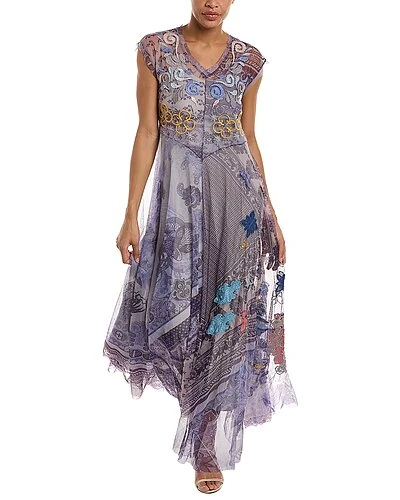- Allegra Dress in multicolor with sheer embroidered mesh design, V-neck, and raw edge trim