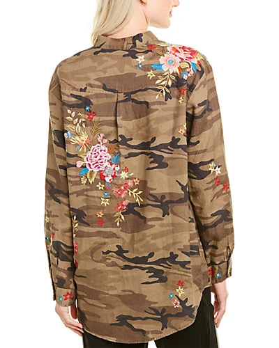 - Amara Linen Shirt in camo with embroidered design, mandarin collar, and 3/4-length sleeves