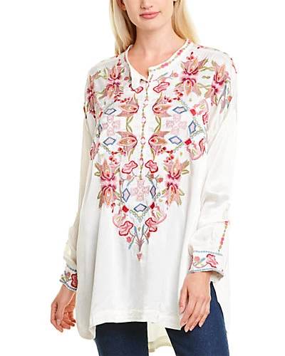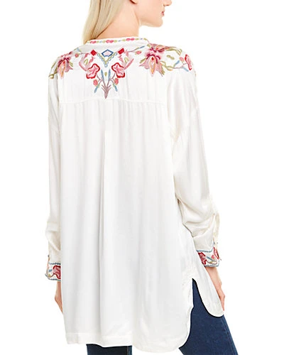 - Calix Top in natural with embroidered detailing, roll-up tabs at sleeves and high-low hem with side slits
