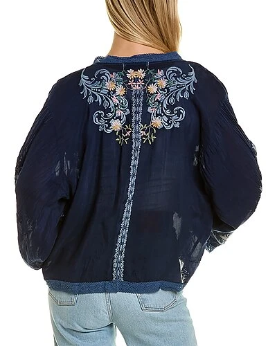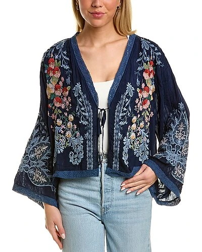 - Carter Kimono in blue night with embroidered design and 3/4-length sleeves