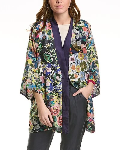 - Chelsea Yena Silk Kimono in blue floral with wide sleeves and dual internal pockets