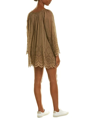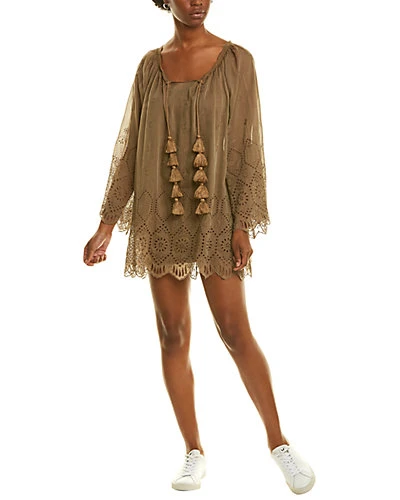 - Babita Silk-Blend Shift Dress in brown with keyhole neck with self-tie detail, tassel accents, embroidered design and eyelet detailing