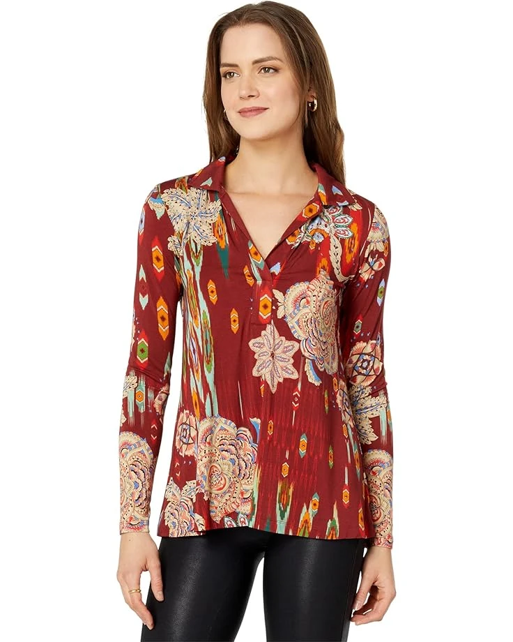 Bring a breezy upgrade to your collection by wearing the Johnny Was® Feather Long Sleeve Swing Polo.SKU: #9855491Relaxed fit.Pullover construction.V-neckline with spread collar.Long sleeves.Slightly uneven hemline.95% viscose, 5% spandex. Machine wash, tumble dry.