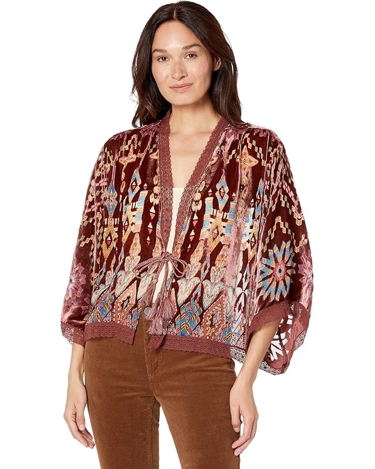 The Johnny Was® Geo Burnout Dazy Kimono is an effortlessly beautiful and admirable piece of clothing that can elevate your flair.SKU: #9848550Relaxed fit.Velvet fabrication.Three-quarter length kimono sleeves and V-neckline.Finished with lace.Tie closure on the front.High-low hemline.Allover print.82% rayon, 18% silk. Dry-clean.