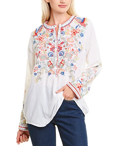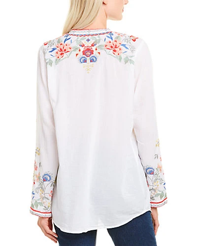 - Ishika Blouse in white with embroidered design, mandarin collar, and 3/4-length sleeves