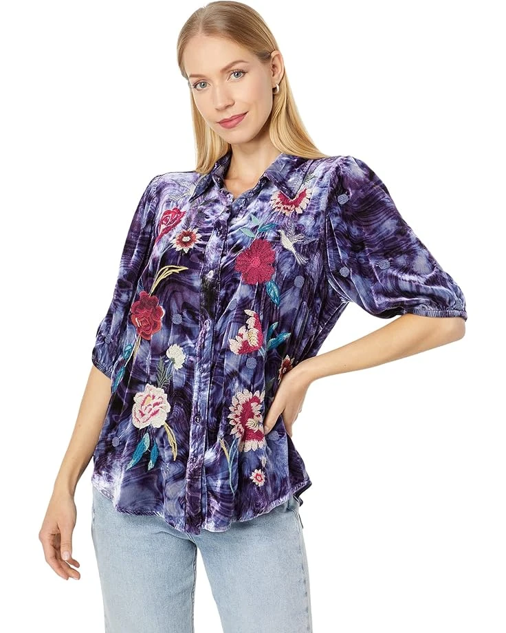 With a velvet touch, the Johnny Was® Junia Velvet Lisbon Shirt offers you a sophisticated and luxe look.SKU: #9848554Pointed collar and half-length sleeves.Buttoned front closure. Floral embroidery on the front. Shirttail hemline. Materials: