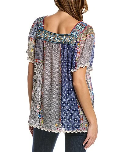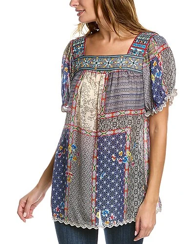 - Kichica Padme Blouse in multicolor with embroidered detailing, short puff sleeves, and eyelet scallop trim