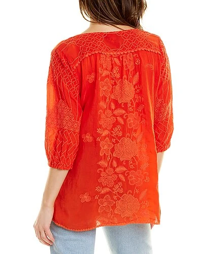 - Jolie Selena Tunic in electric coral with embroidered design and 3/4-length sleeves