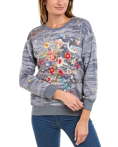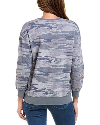 - Lissa Sweatshirt in indigo camo with embroidered design, dual side on-seam pockets, and ribbed trim