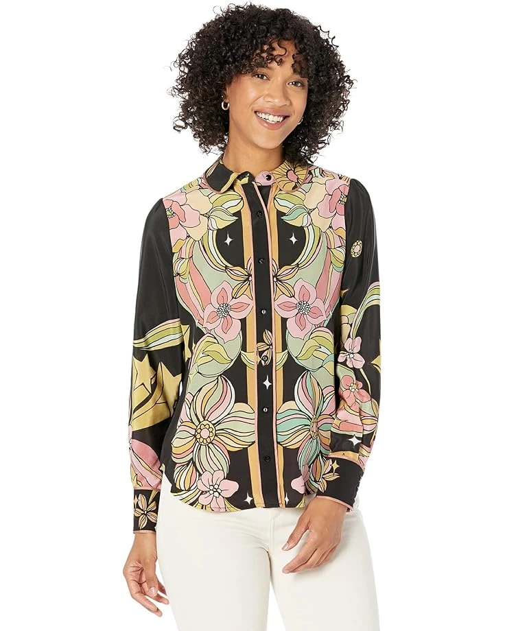 Displaying a striking fusion of the classic and the contemporary, the Johnny Was® Luz Piped Blouse will surely give you a chic look along with all-day comfort.SKU: #9848558Collared neckline and long sleeves with buttoned cuffs.Buttoned front closure.Piping detail.Allover bold and beautiful floral print.Curved hem.100% silk.Dry-clean.Imported.Product measurements were taken using size XS. Please note that measurements may vary by size.Measurements: