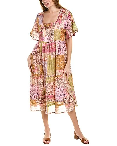 - Macy Silk-Blend Midi Dress in multicolor with square neckline and flutter sleeves