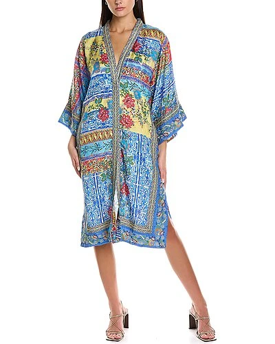 - Midsummer Namaka Silk Kimono in blue multicolor with embroidered trim, dual side seam pockets and side slits at hem