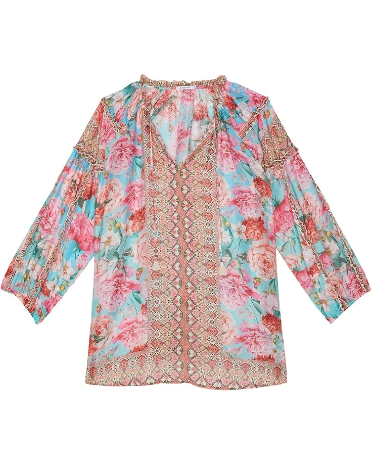 Express your style in this elegant and comfy Johnny Was® Plus Size Rose Narcisa Blouse.SKU: #9891552Pullover style.V-neckline with ruffle trim collar and self-tie string.Long sleeves.Straight hemline.Allover unique print.100% silk.Dry-clean.Imported.