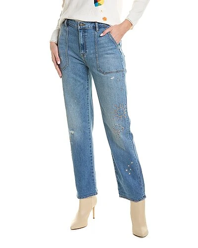 - Sovanna Worker Jean in vintage worker with belt loops, whiskering and fading details, slight distressed detailing, embroidered detailing, and four-pocket styling