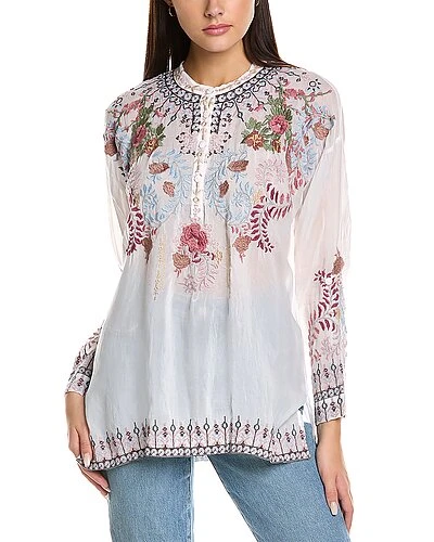 - Sundae Tunic in white with embroidered design, mandarin collar, and roll-up button cuffs
