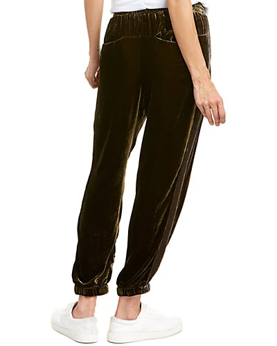 - Vitaly Silk-Blend Pant in olive with velvet design with embroidered accents, dual front angled pockets, elasticized cuffs, and elasticized waistband