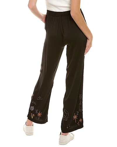 - Yogi Silk-Blend Pant in black with embroidered design, dual front angled pockets, and elasticized drawstring waistband