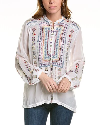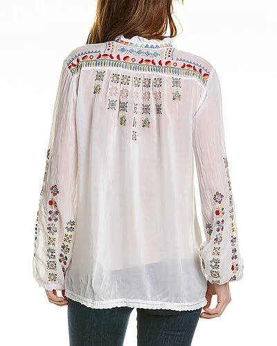 - Zeru Blouse in white with embroidered floral design and scalloped hem